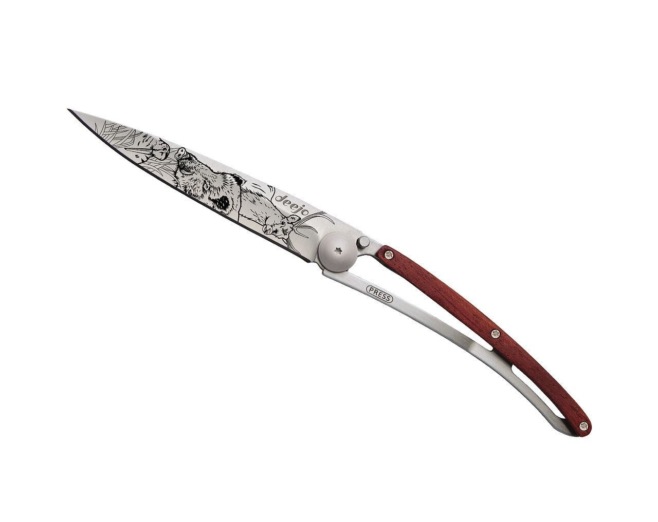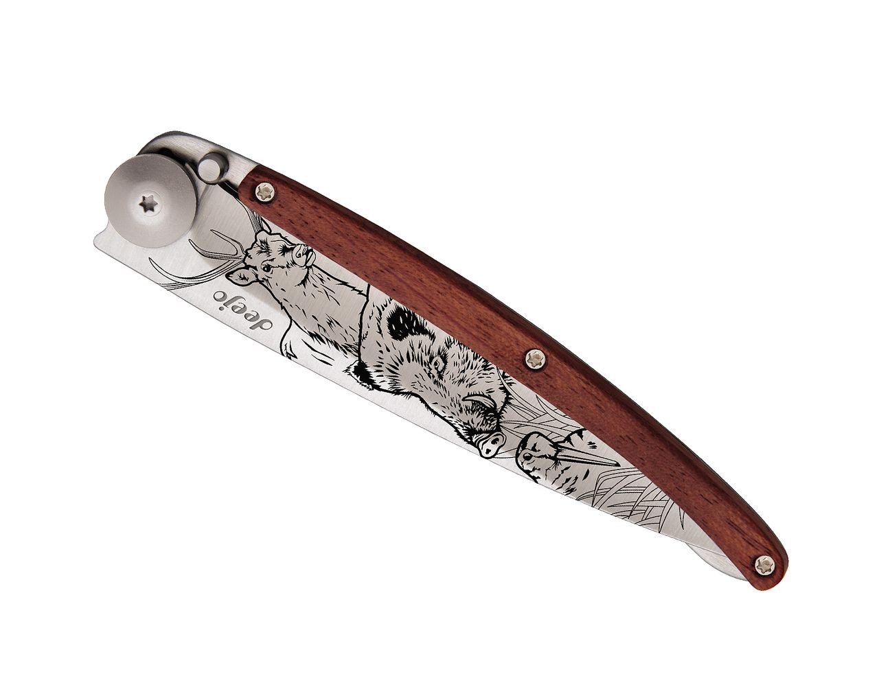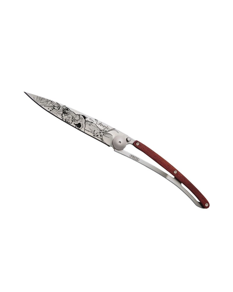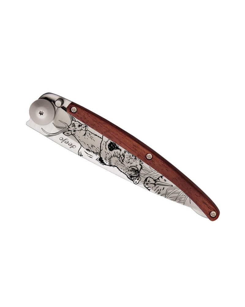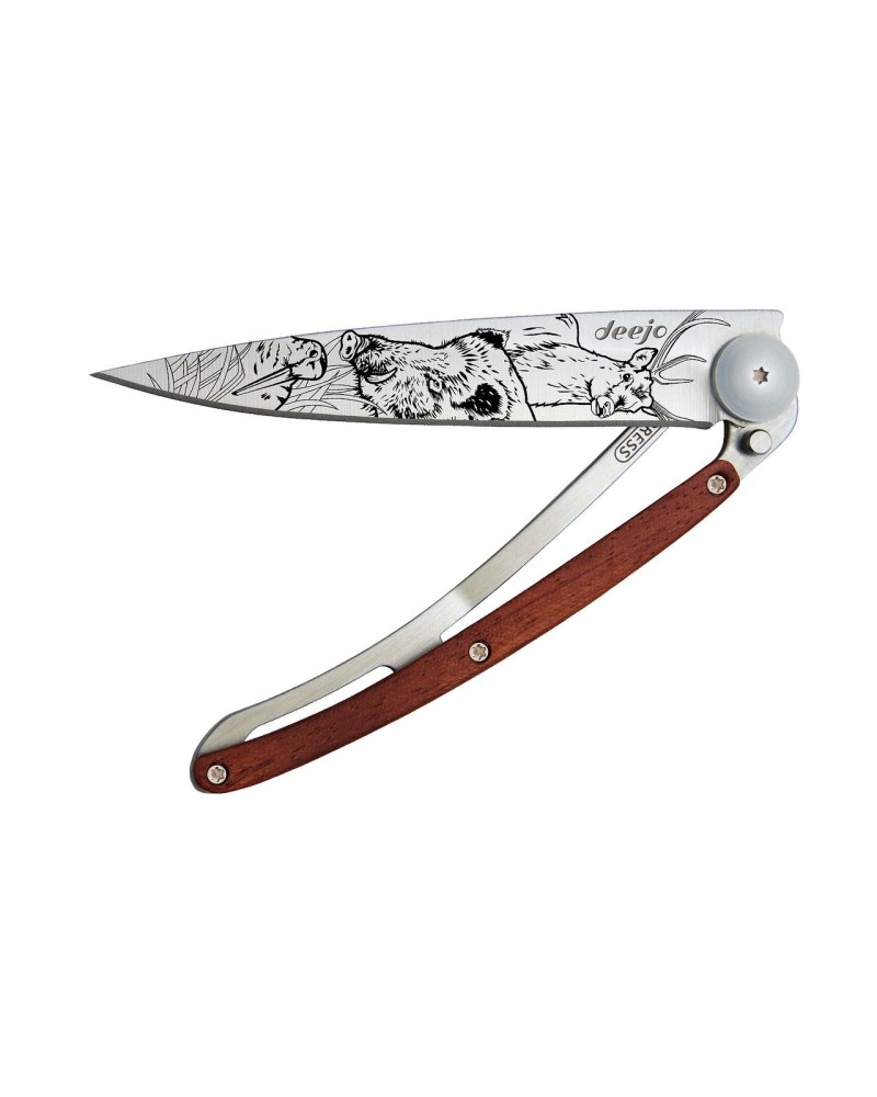 Couteau Deejo Titane Bois Corail Scene de Chasse 37 g