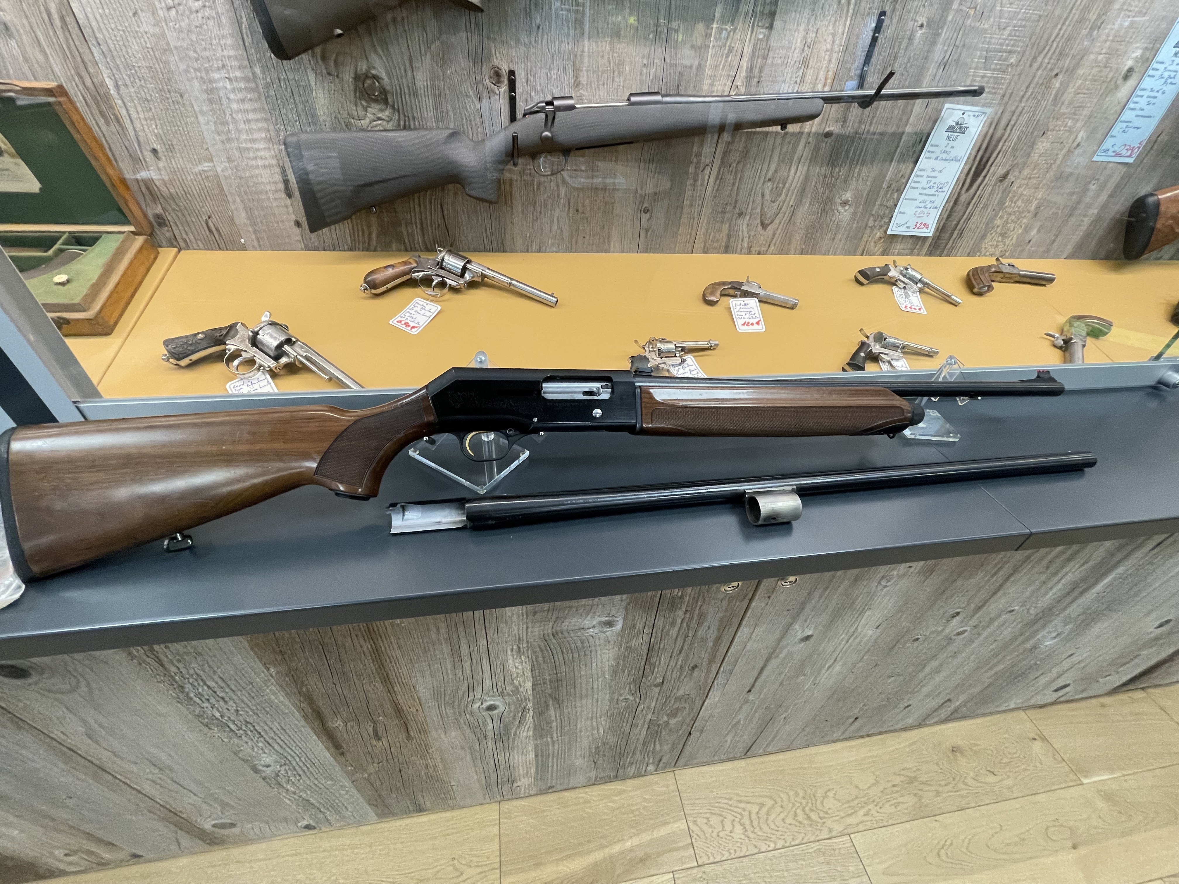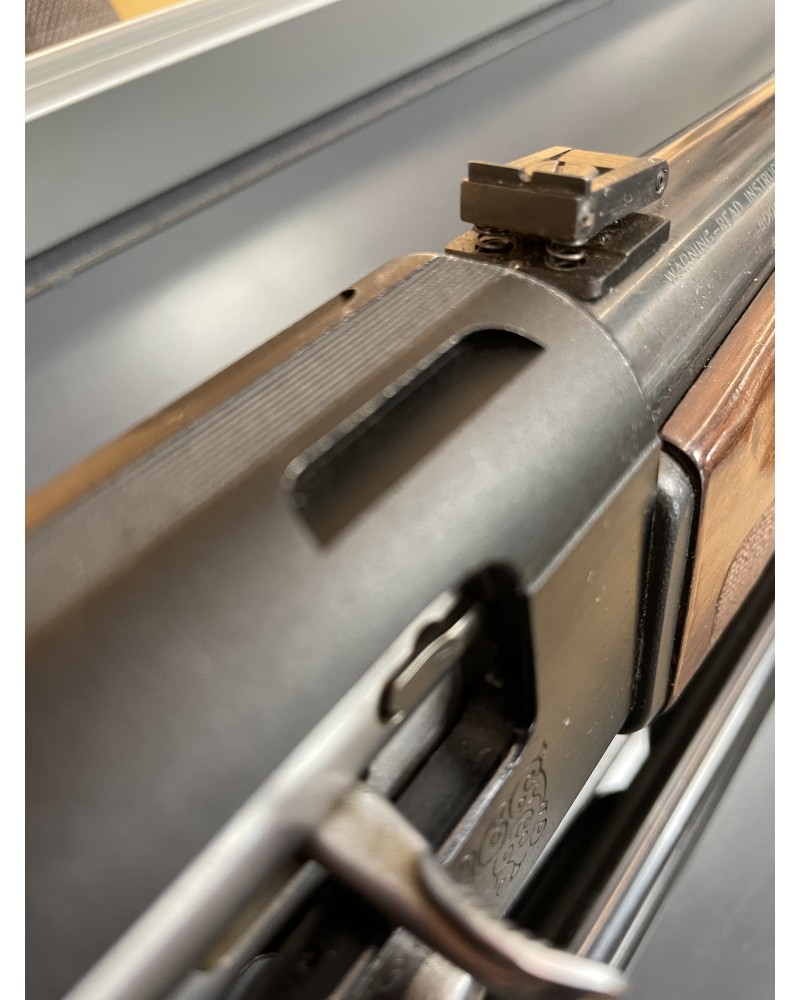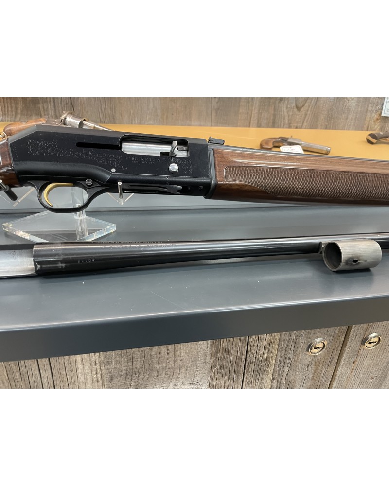 Livré avec deux canons, 1 canon 76cm avec 4 choques interchangeables et un canon de 61cm spécial balles avec hausse réglable et guidon fibre, outil et document d'origine.