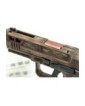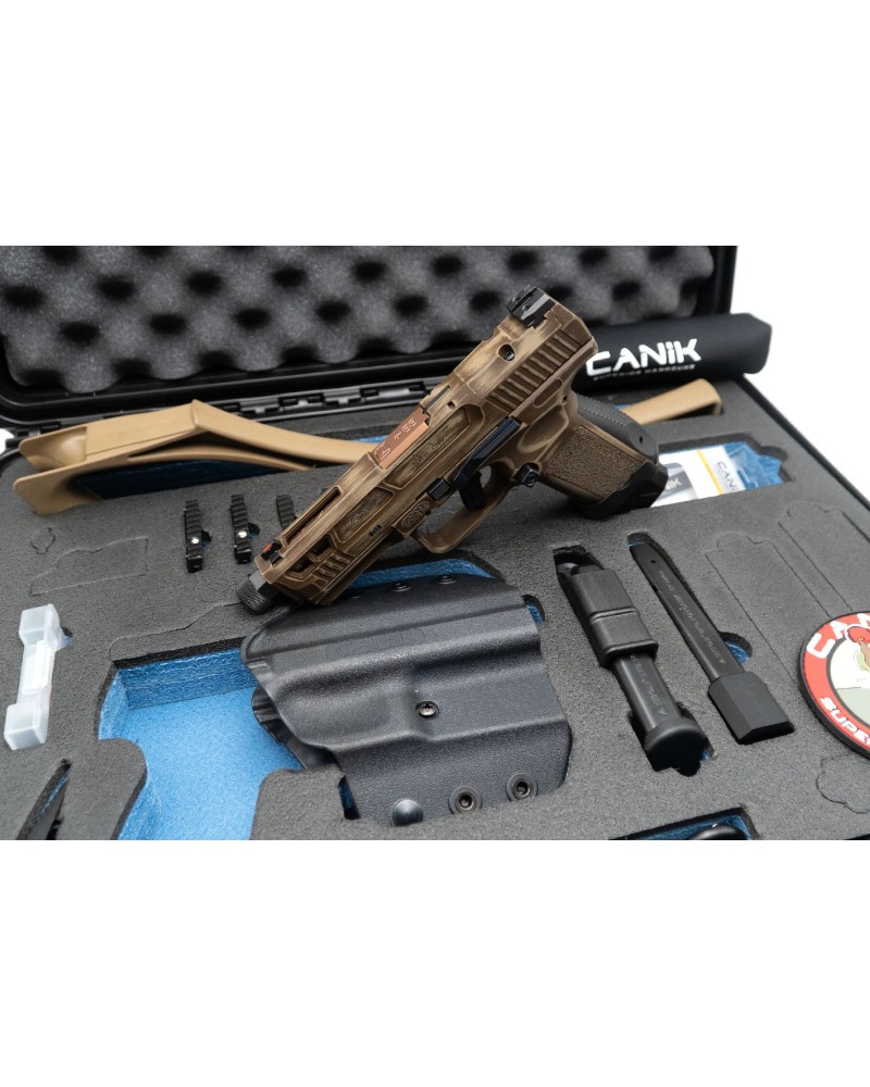 - Accessoires : 3 chargeurs, 4 platines pour y adapter un viseur point rouge, 1 protège culasse de la marque en Néoprène, 1 crosse Armbrace FDE, 1 ressort plus souple, 1 patch Canik